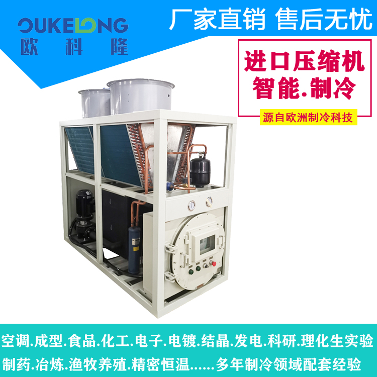 風冷箱式防爆冷水機,是歐科隆制冷打開市場的拳頭產(chǎn)品,歐科隆制冷擁有廣泛的防爆冷水機配套經(jīng)營,包括臭氧發(fā)生器,甲烷發(fā)電,化工化纖,石油天然氣,新型環(huán)保行業(yè)等,歐科隆防爆冷水機采用隔爆、增安、本安、正壓、充油、充砂、無火花、澆封和氣密等多種防爆方式,使機組可以在易燃易爆場合使用。